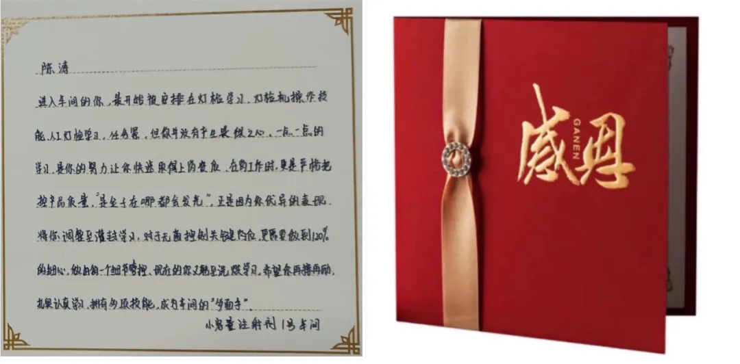 感謝卡:進入車間的你,最開始被安排在燈檢學(xué)習(xí),燈檢機操作技能、人工燈檢學(xué)習(xí),任務(wù)緊,但你并沒有產(chǎn)生畏懼之心,一點一點的學(xué)習(xí)。是你的努力讓你快速取得上崗資質(zhì)。在崗工作時,更是嚴格把控產(chǎn)品質(zhì)量?!笆墙鹱釉谀亩紩l(fā)光”,正是因為你優(yōu)異的表現(xiàn),將你調(diào)整至灌封學(xué)習(xí),對于無菌控制關(guān)鍵崗位,更需要做到120%的細心,做好每一個細節(jié)管控?,F(xiàn)在的你又轉(zhuǎn)至洗烘學(xué)習(xí),希望你再接再勵,扎實認真學(xué)習(xí),擁有多項技能,成為車間“多面手”。