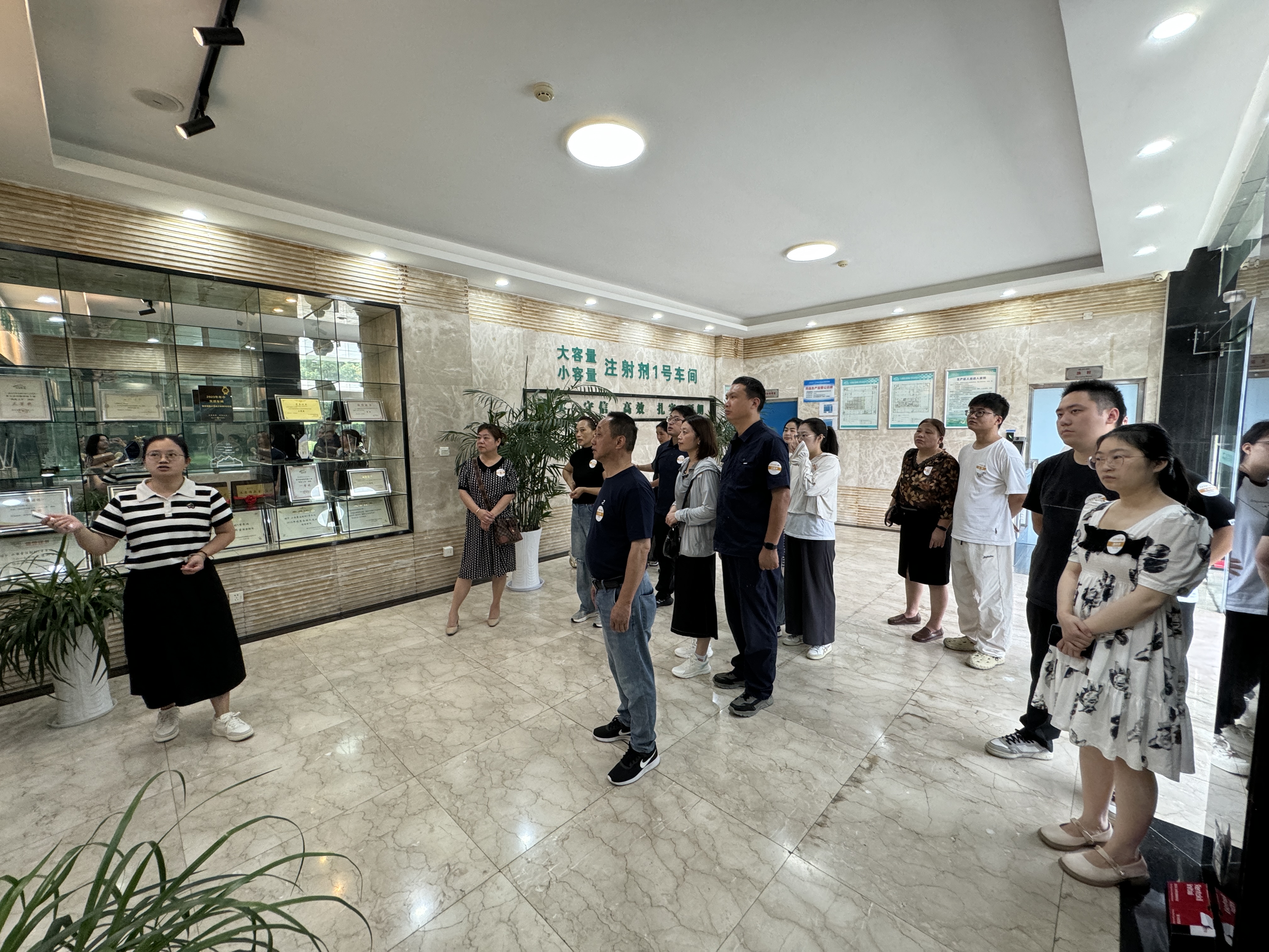 海陵基于此LOGO定制了一系列紀(jì)念品,包括太陽帽、太陽傘、帆布包及合影板。這些定制品貫穿于家屬日的各個(gè)環(huán)節(jié),讓每一位參與者都能感受到了公司的貼心與關(guān)懷。特別9月13日上午,家屬們首先在“南京海陵第九屆家屬日”的合影板前留下了珍貴的瞬間。鏡頭下,每一位工匠與家屬的笑容都洋溢著幸福與期待,為接下來的活動(dòng)拉開了溫馨的序幕。隨后,他們正式開啟了參觀之旅,依次走進(jìn)了小容量注射劑1號(hào)車間、固體制劑1號(hào)車間、檢測(cè)中心、物料倉庫和行政樓。每到一處,專業(yè)講解員都耐心地為家屬們介紹生產(chǎn)流程、質(zhì)量檢測(cè)、倉庫管理以及企業(yè)文化,讓家屬們零距離感受到了海陵“為親人制藥、為父母制藥”的質(zhì)量文化。