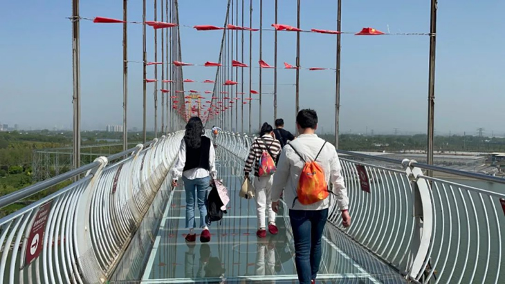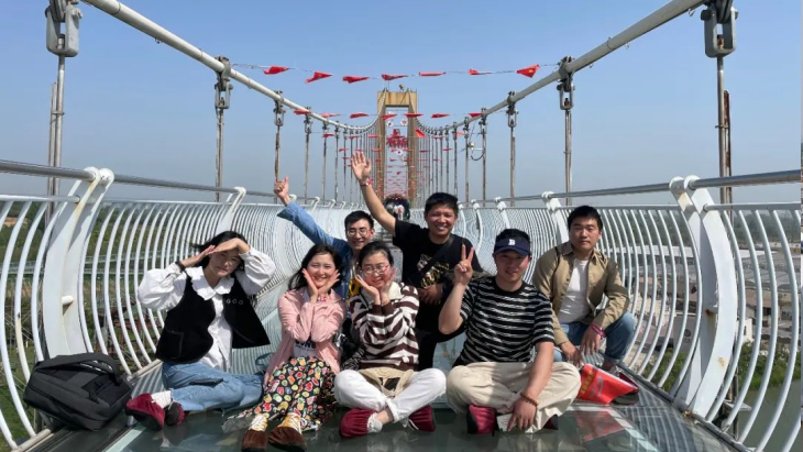 午后升溫的烈日下,完成競賽的成員三五成群的來到游樂設(shè)施區(qū)域。最火爆的項(xiàng)目非“鵲橋”——高空玻璃棧道莫屬。