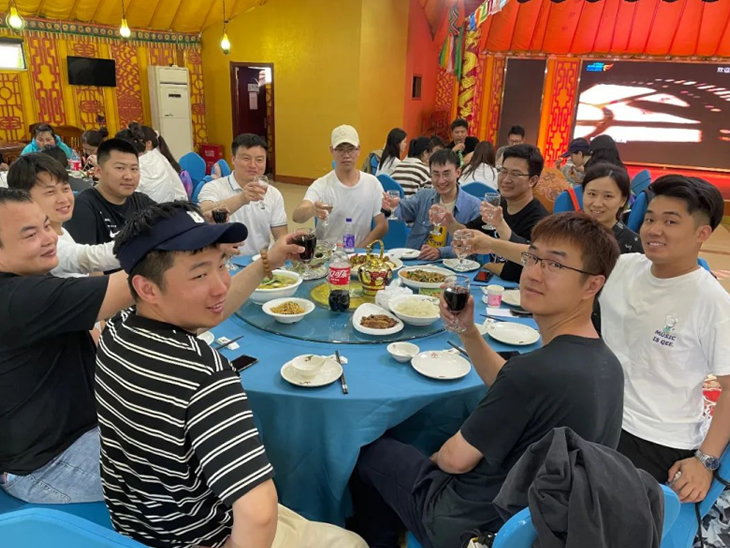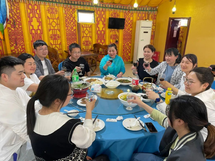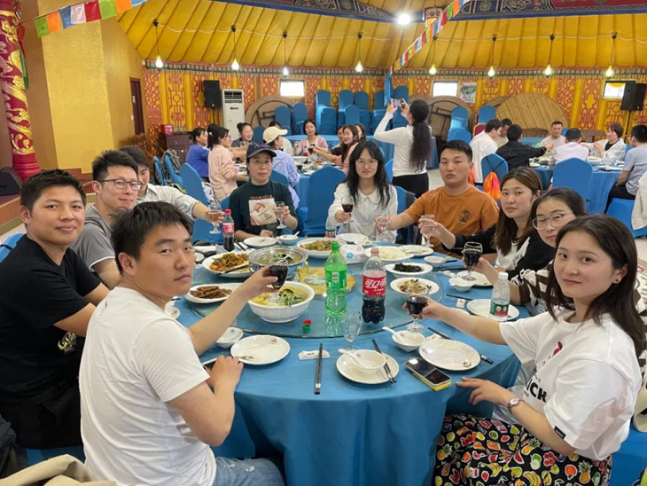 結(jié)束頒獎后,一行人談笑風(fēng)生地步行前往“蒙古大營”,走進(jìn)用餐區(qū),一個個或大或小的蒙古包映入眼簾,落日余暉下的風(fēng)景讓人深感民族特色。大家圍坐在桌旁,享用美味晚餐,幸運(yùn)的我們還觀賞到蒙古族歌曲、舞蹈、和馬頭琴的驚喜表演。